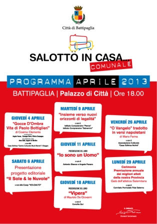 Battipaglia. Anche per il mese di aprile il "Salotto in casa comunale", che si svolge presso l'Atrio del Palazzo di Città di Battipaglia, prevede lo ...